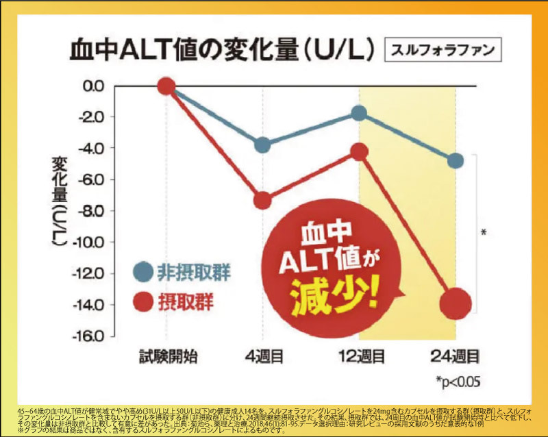 ※抗酸化力をアップし、高めの血中ALT値を下げるスルフォラファンによる効果
